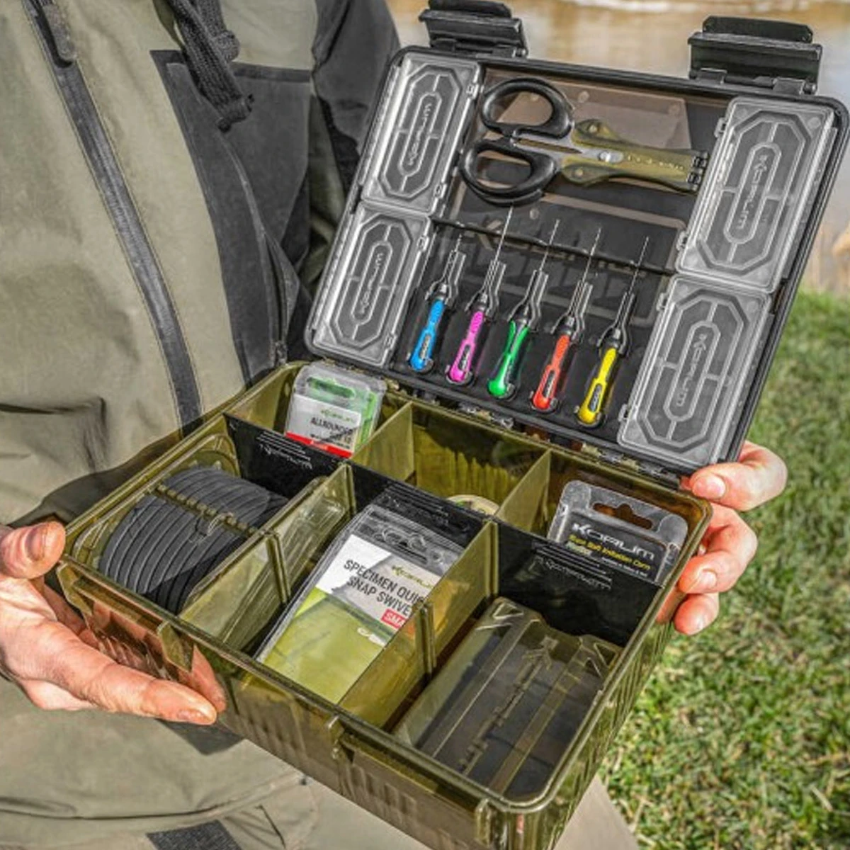 BLOX is een nieuw opslagconcept voor visgerei dat volledig gericht is op iedere barbeel, karper en witvisser! Ontworpen om alles wat je nodig hebt op één goed georganiseerde plek te huisvesten. We hebben BLOX zorgvuldig op maat gemaakt om onmisbare items van end-tackle op te bergen, zoals spoelen met lijn, pakjes haken en accessoires. Er is de mogelijkheid om de speciale BITS BLOX te gebruiken als je de voorkeur geeft aan compartimenten, en om end-tackle in het deksel van de doos te kunnen plaatsen. Je aas tools en schaartje klikken allemaal netjes op hun plaats, terwijl de hoofdbox kan worden aangepast met verdelers om aan je behoeften te voldoen. Indien gewenst kun je ook je RIG BLOX erin stoppen, zodat al je voorgeknoopte onderlijnen beschermd zijn tegen de elementen van buitenaf.