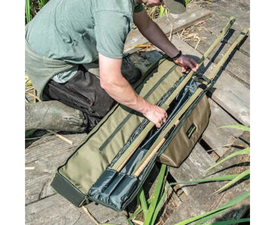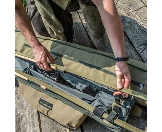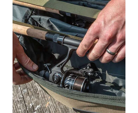 Een totaal nieuw concept in de hengelkoker, die een innovatieve nieuwe manier biedt om uw geladen hengels en reels mee te nemen, naast uw shelters, brollies en bankgerei. Het vak voor uw hengels scharniert weg van het achterste schuilvak, en biedt alle voordelen van een koker met extra bescherming voor uw hengels. Heeft een royale gewatteerde ruimte voor drie hengels en haspels, plus een groot achtervak waar alle Korum shelters en brollies in passen. Heeft ook een eenvoudig buitenvak voor netten, handgrepen of banksticks.